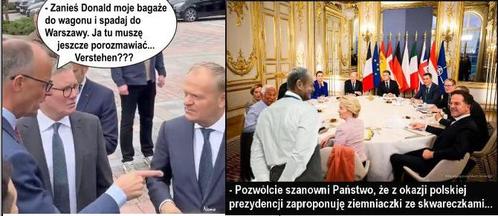 I teraz Niemcy mają problem. Bo trzeba byłoby się nauczyć pracy od nowa. Wyobraźcie to sobie: Hans z Monachium w kaloszach, zgięty wpół, zbiera ogórki. Jego żona, Gertruda, myje toalety w hotelu, a nie planuje weekend z szampanem w Toskanii. Syn, Kevin (tak, tam też są Keviny), uczy się spawania, a nie marketingu emocjonalnego na uniwersytecie. I w tym miejscu mózg przeciętnego obywatela RFN zawiesza się jak Windows 95 po zetknięciu z pendrivem. Nie byłoby w tym nic złego — praca fizyczna przecież nie hańbi — ale Niemcy oduczyli się pracować tak skutecznie, że ich dziadkowie musieliby chyba znów uruchomić przymusowe obozy pracy, żeby im przypomnieć, jak się kopie rowy. A, no tak — w tym to akurat mają historyczne doświadczenie. I organizacyjnie, i logistycznie, i nawet z niemiecką precyzją, z której świat się nie może do dziś otrząsnąć. Ale żeby było jasne: ja Niemców nie potępiam. Serio. Nawet ich trochę rozumiem. No bo kto by nie chciał, żeby ktoś inny za niego zapieprzał i jeszcze z uśmiechem wynosił śmieci? Ja też bym chciał. Ale życie to nie folder z Ikei — nie składa się samo. Trzeba robić swoje. Tylko że jak przez dekady uczysz się, że brud pod paznokciami to sprawa „tamtych”, to trudno potem samemu chwycić za łopatę. Zwłaszcza gdy „tamci” zorientują się, że wcale nie muszą całe życie stać po złej stronie szpadla. I tak siedzą teraz redaktorzy w Frankfurter Allgemeine, stukają palcami w spocone czoła i pytają dramatycznie: Was nun? A odpowiedź jest prosta: teraz to, drodzy Niemcy, czeka was powrót do rzeczywistości. Tylko że może już nie na własnych zasadach. No chyba że Tusk dalej będzie rozdawał karty. Wtedy pełne busy znowu ruszą na zachód — bo jego rządy to jak migające zielone światło dla kryzysu, bezrobocia i taniej siły roboczej. Wyjazd nie będzie wyborem, tylko koniecznością. A pan premier? Cóż... jak to szło? Für Deutschland, Herr Tusk?
